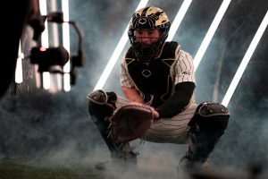 Primero, en verdad, es jugando a atrapar con tu pitcher y también atrapando en los bullpens. Siempre va a haber pitchers que tienen la bola un poco más dura. Hay algunos pitchers con una recta más alta, más baja, una curva que baja así o baja para el otro lado. Entonces, es cuestión de aprender los lanzamientos con el tiempo, jugando a atrapar con ellos, aprendiendo cómo se mueven sus lanzamientos para que cuando los esté atrapando en el juego ya sepa cómo se mueven sus lanzamientos, ya sepa cómo se mueve su recta. Y en este nivel, la velocidad no es un factor tan grande. Todos lanzan más o menos en el mismo rango.
