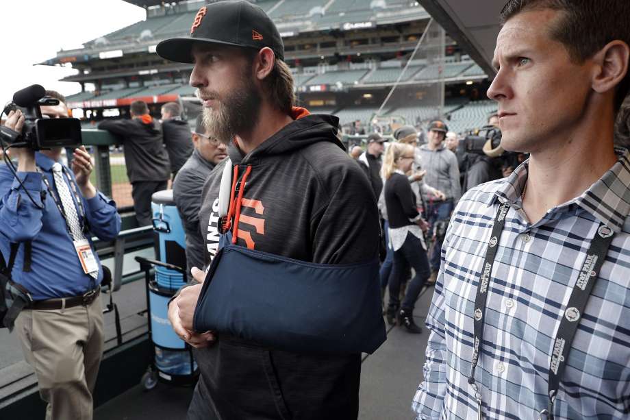 El ace de los Giants con el brazo en cabestrillo. |