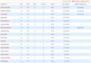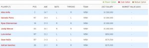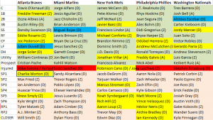 Esta es la pinta que tendrían los rosters de los equipos de la división colocados según posición e indicando si son diestros o zurdos bateando o lanzando y donde en amarillo están los jugadores con el futuro no asegurado, para visualizar los vacantes cara al 2022, y en azul los jugadores que o bien han renovado o son nuevos en el equipo.