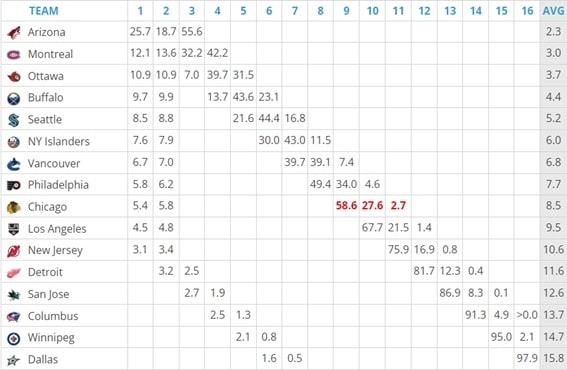 Un sorteo de las posiciones del draft resolvería -en principio y puede que menos de lo deseado- que los equipos intenten perder lo máximo posible para ser el peor equipo de la liga. Calcando el sistema NHL, el peor equipo tiene -por sistema- uno de los tres primeros picks por obligación. El peor, puede ser de 1 al 3, no es el #1 por imposición. Es un cambio muy sustancial, ya que en NHL el 55,6% de veces el peor va a ser el #3 del draft. O sea, ser el peor te asegura un pick top 3, pero es más posible que sea el #3 que #1. Véase la tabla inferior.